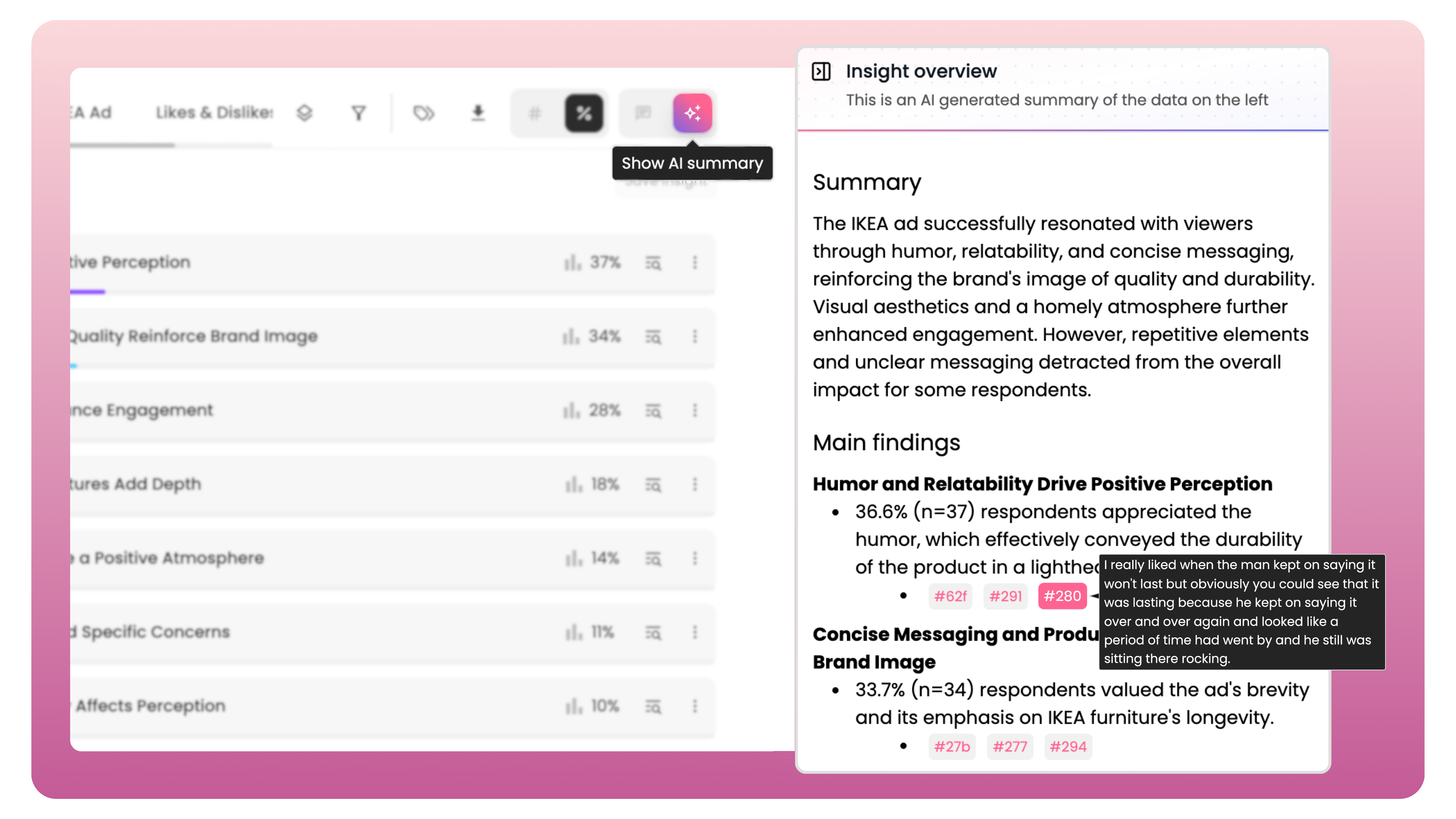 Automatic AI Summary addresses this by adding an immediate qualitative layer on top of each analysis. It narrates the results, showing what each theme signifies, how strong it is, and why it matters.